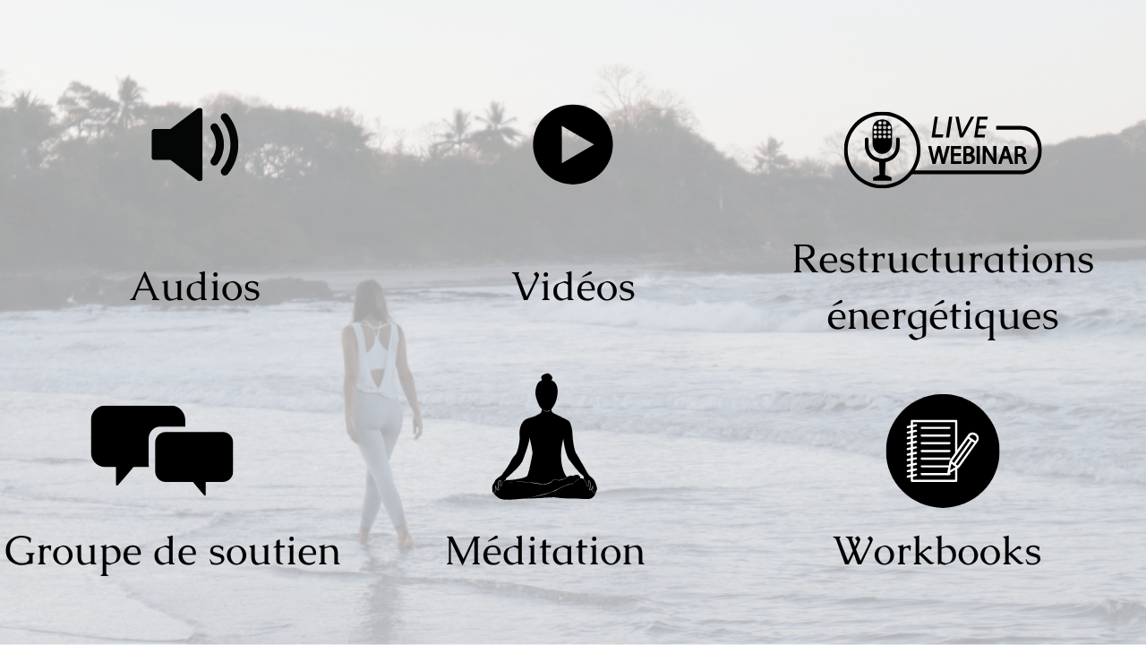 Chaque semaine un module se débloque avec vidéos, audios et exercices. Toutes les deux semaines je donne un live de restructuration énergétique en groupe sur zoom où je traite vos problématiques personnelles.