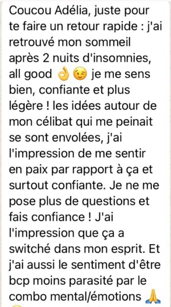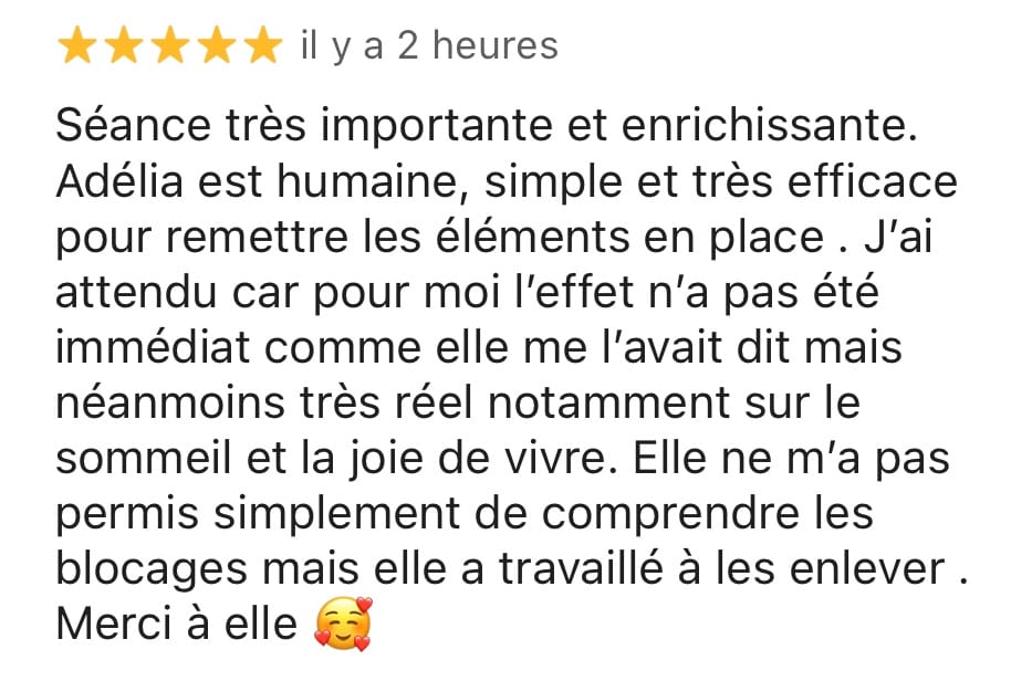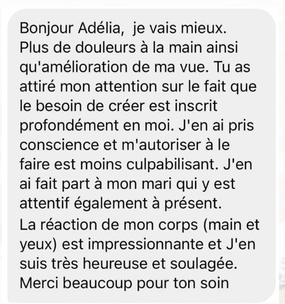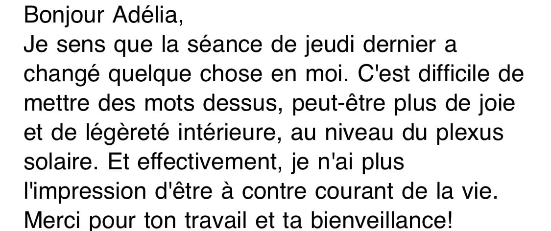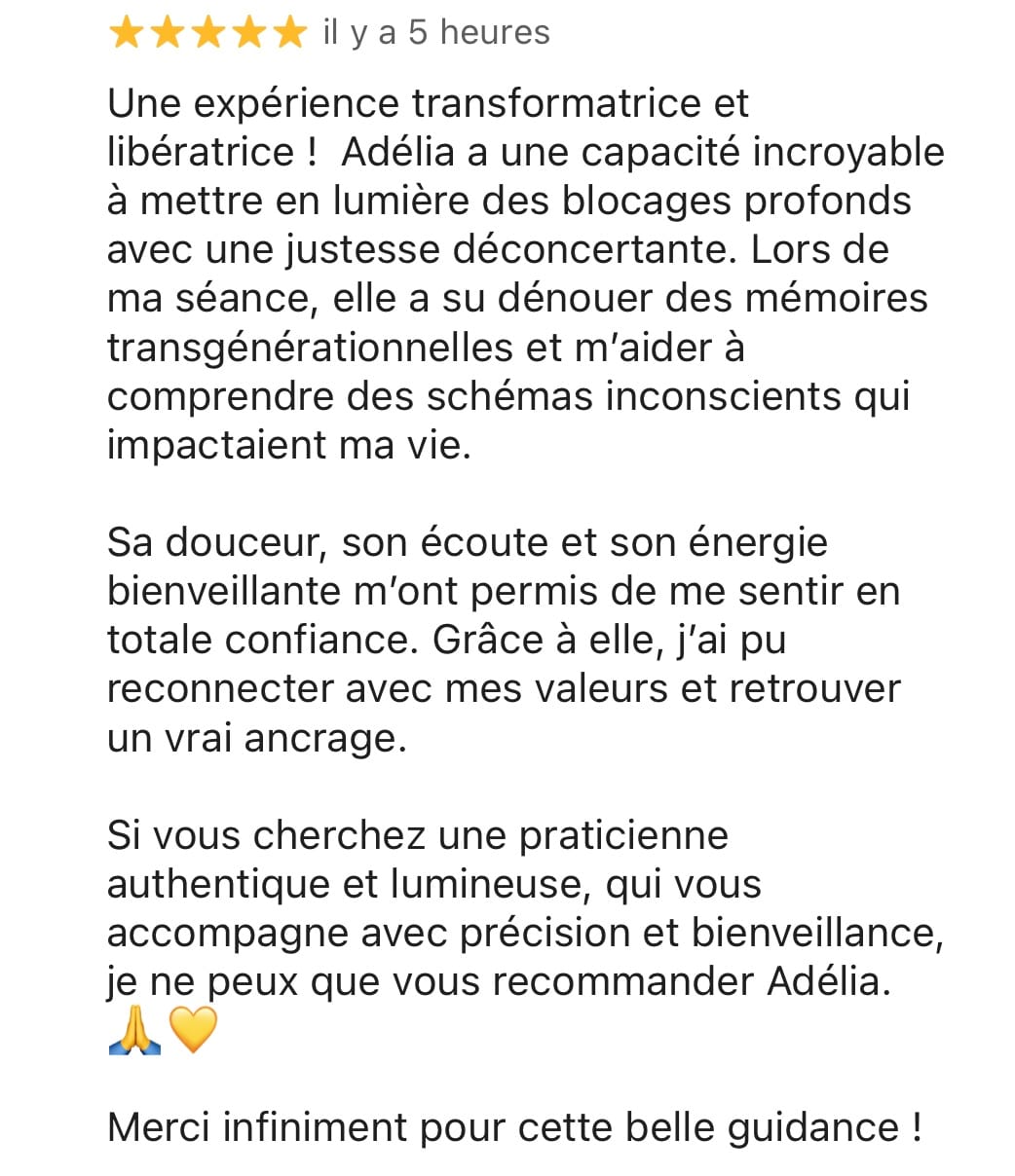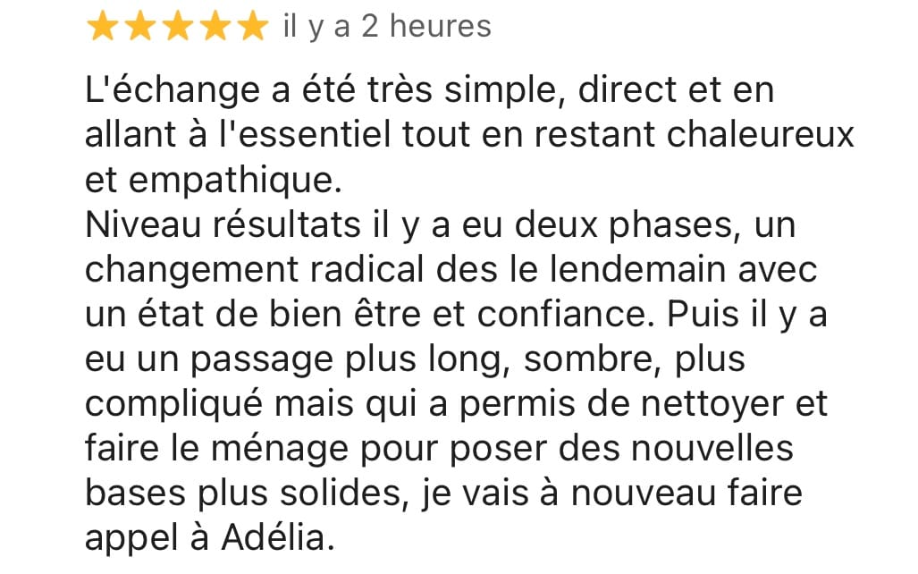 "Consultation extraordinaire avec Adélia. Fabuleux, magique! Cela faisait quelques semaines que je me sentais fatiguée, déconnectée, empêtrée avec moi-même et depuis hier, au cours et dès la fin de la consultation et surtout ce matin au réveil, waouh, je me sentais beaucoup plus légère mais surtout confiante et rassurée. Je souhaite à chacun.e de pouvoir avoir la chance de se faire aider et de bénéficier de telles consultations avec une si belle personne, bienveillante, compétente, puissante et d'une humilité remarquable."