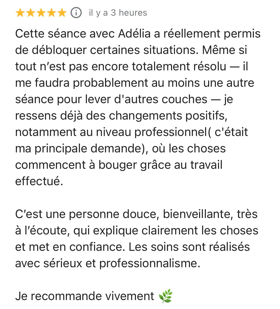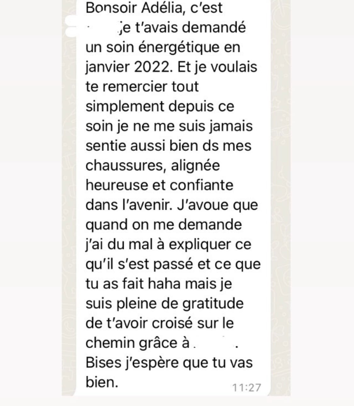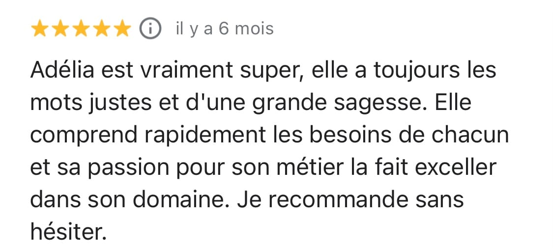 "Adélia est une thérapeute qui fait partie de ceux qui ont un vrai "don". Douée dans ce qu'elle donne, douée dans les soins qu'elle propose. Elle va percevoir de manière juste et précise ce qui bloque dans les différents champs énergétiques et permettre à celui qui reçoit le soin de grandir et de s'élever sur son chemin de vie. Son approche est très professionnelle, elle trouve les mots justes pour communiquer et nous donne des clés pour avancer sereinement. Je suis très reconnaissante de l'aide qu'elle m'a apportée sur le plan personnel et professionnel".